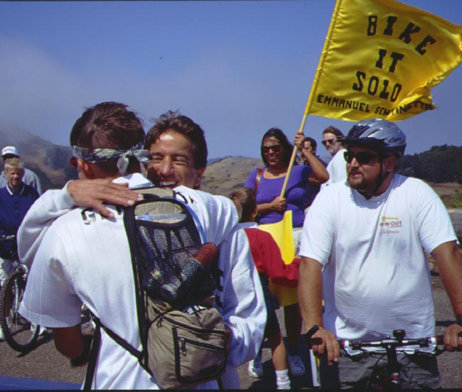 More hugs at the Golden Gate Bridge, this one from Mr. Dave Urquhart.  In the back my Mom with the Bike It Solo flag